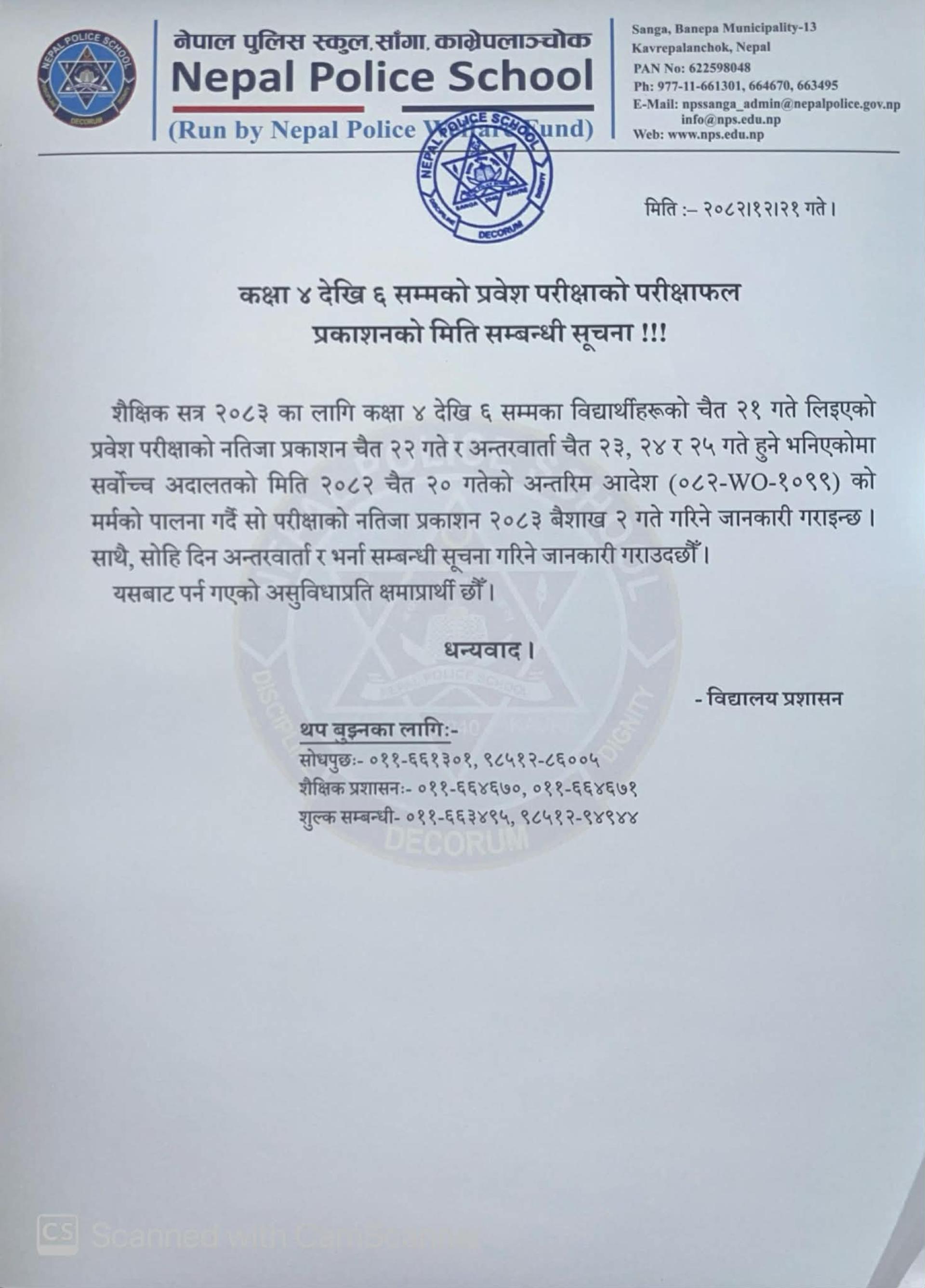 कक्षा ४ देखि ६ सम्मको प्रवेश परीक्षाको परीक्षाफल प्रकाशनको मिति सम्बन्धी सूचना !!!